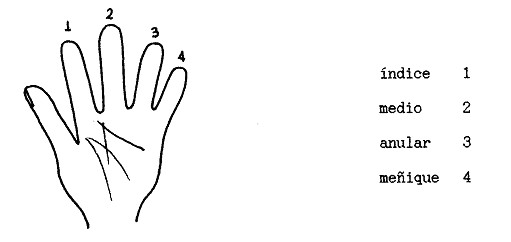 La anterior ilustración inicia con dedo 2 (corazón) y tiene su extensión en la última cuerda (segundo orden). La digitación es la siguiente: